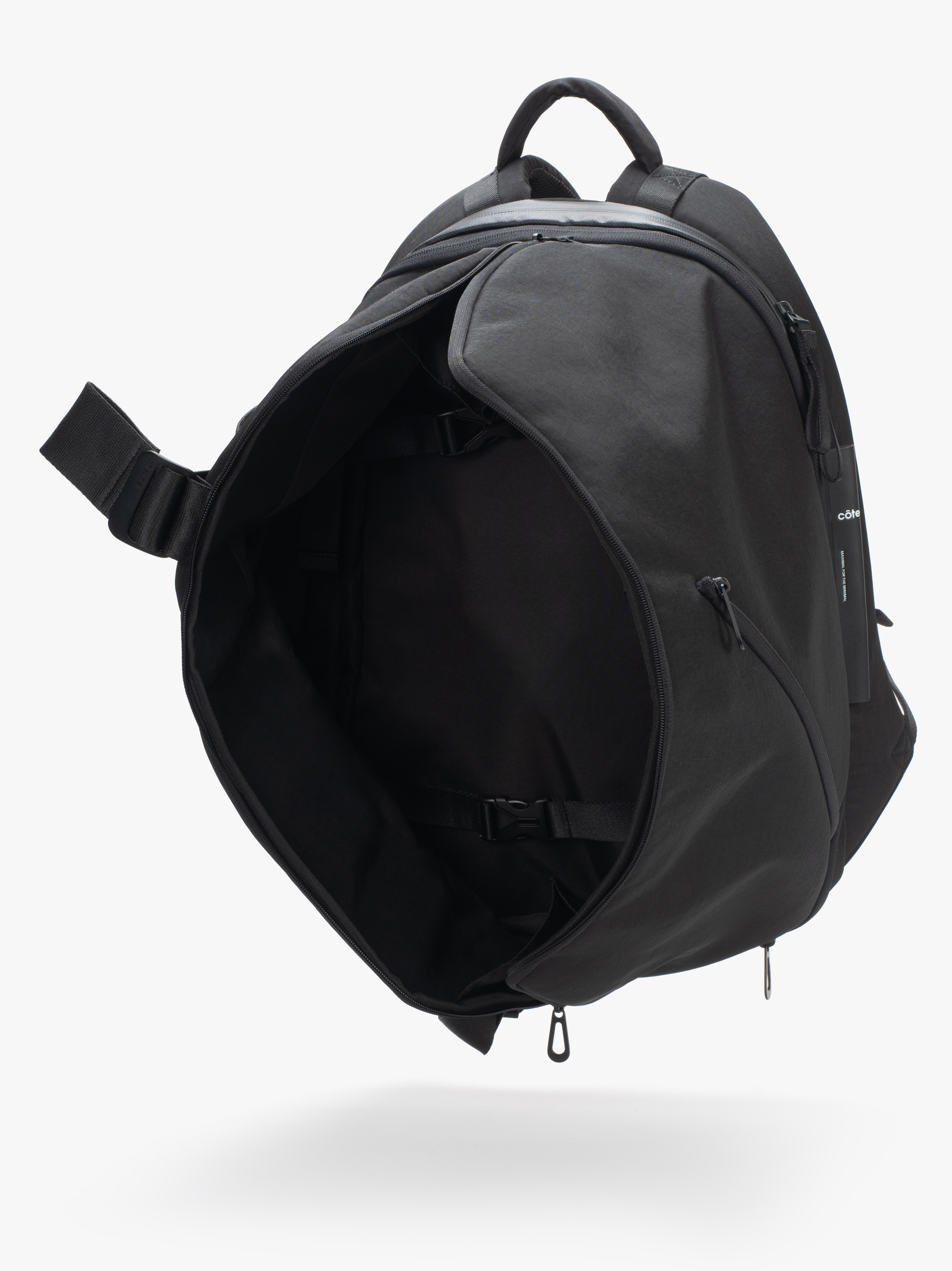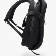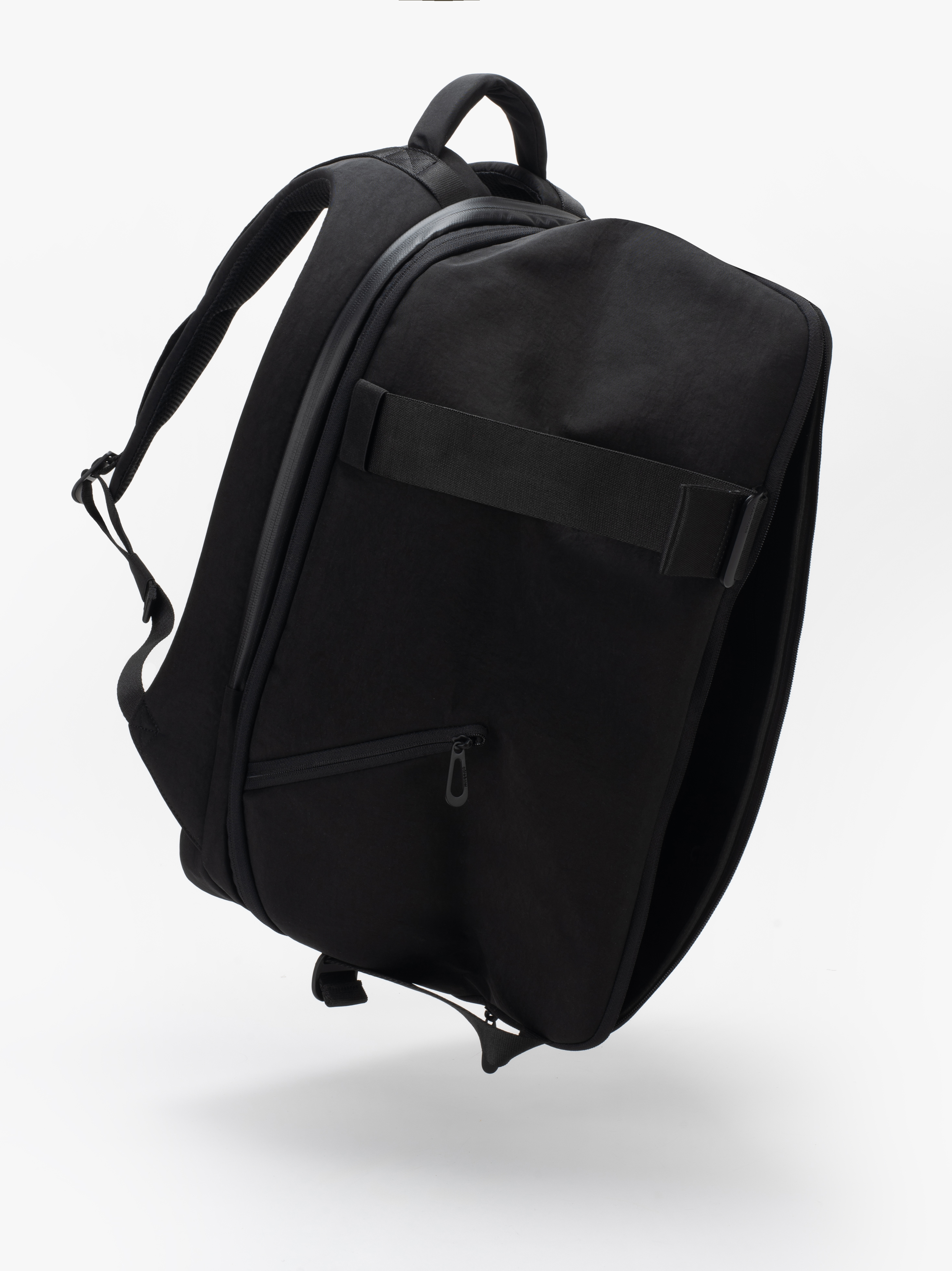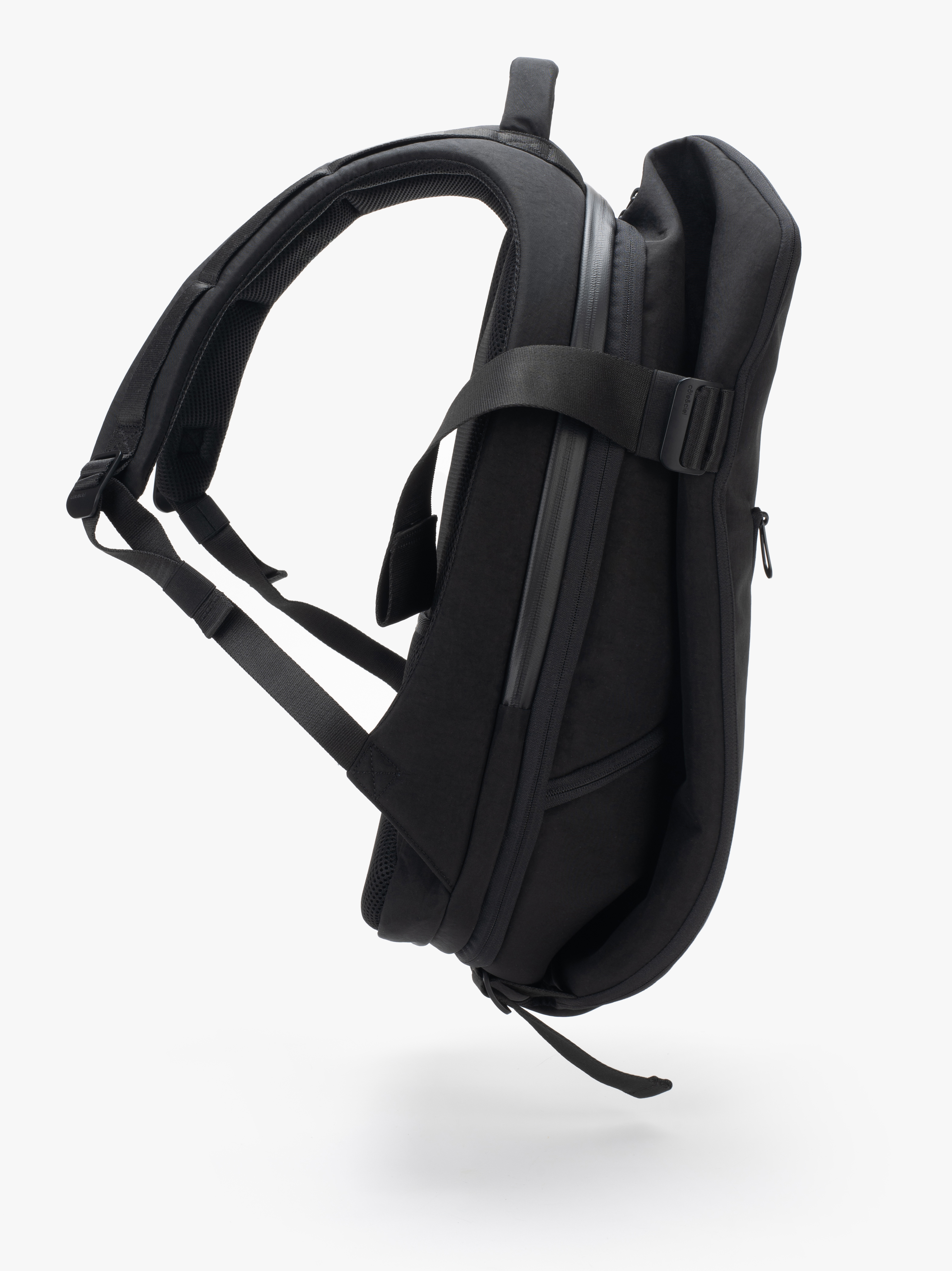 The backpack's body is made from ‘Carbon Black’ fabric. The exterior adjustment system works in tandem with the ISAR M Round’s volume, expanding and condensing depending on the capacity. The main compartment houses a padded laptop pocket for devices up to 16", and a hidden pocket can be found on the outside.
