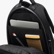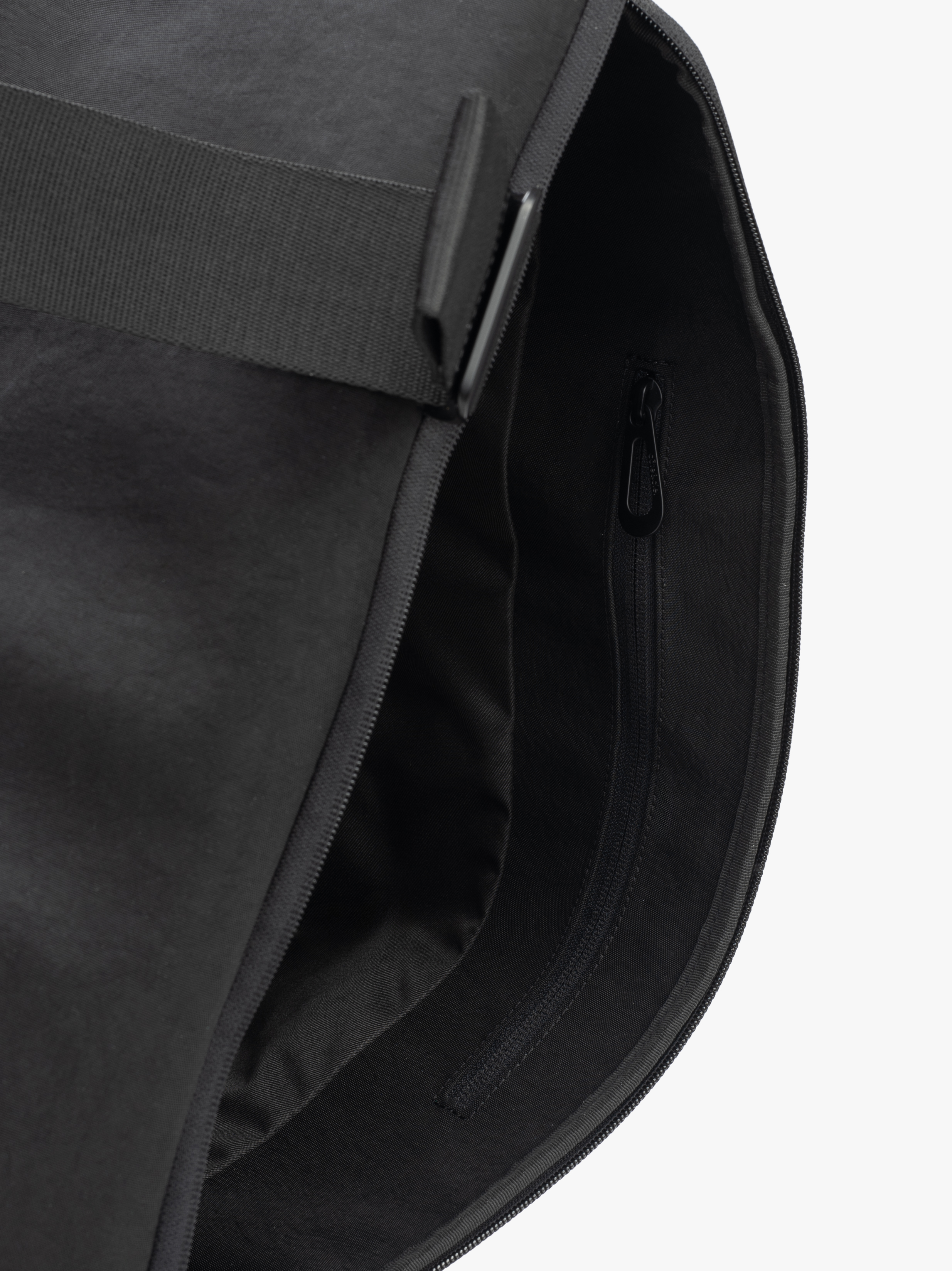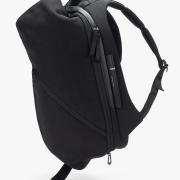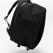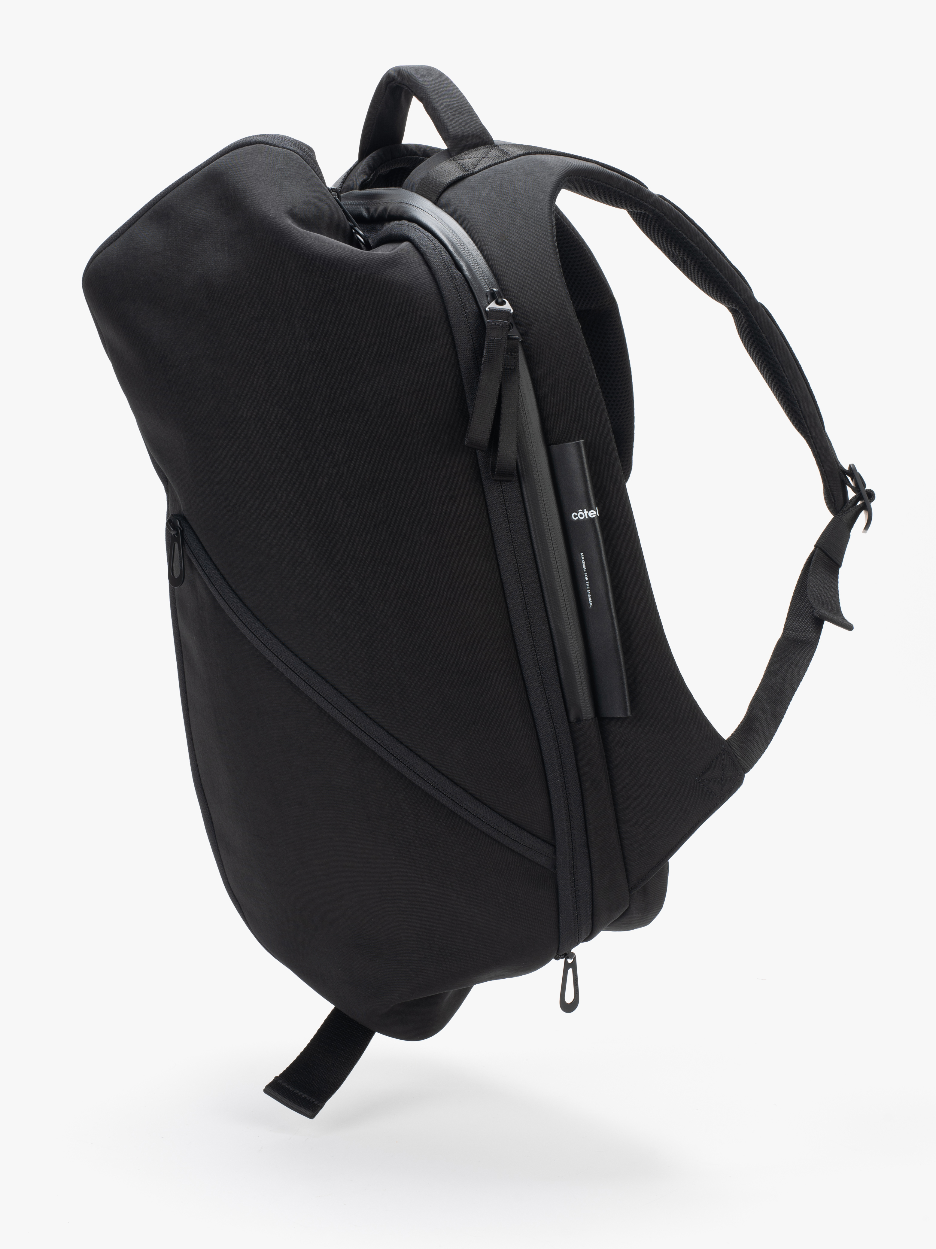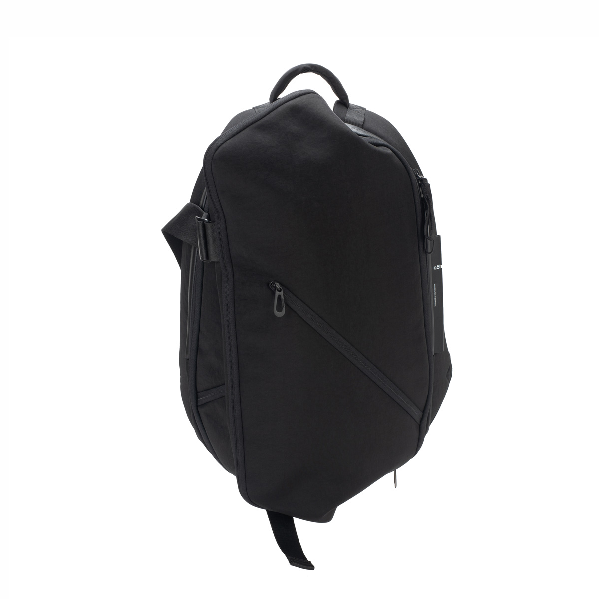 The backpack's body is made from ‘Carbon Black’ fabric. The exterior adjustment system works in tandem with the ISAR M Round’s volume, expanding and condensing depending on the capacity. The main compartment houses a padded laptop pocket for devices up to 16", and a hidden pocket can be found on the outside.
