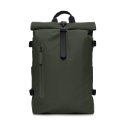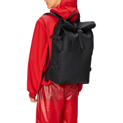 Der Rolltop Rucksack ist aus dem charakteristischen wasserdichten PU-Gewebe von Rains gefertigt, das robust und langlebig ist und sich angenehm anfühlt.