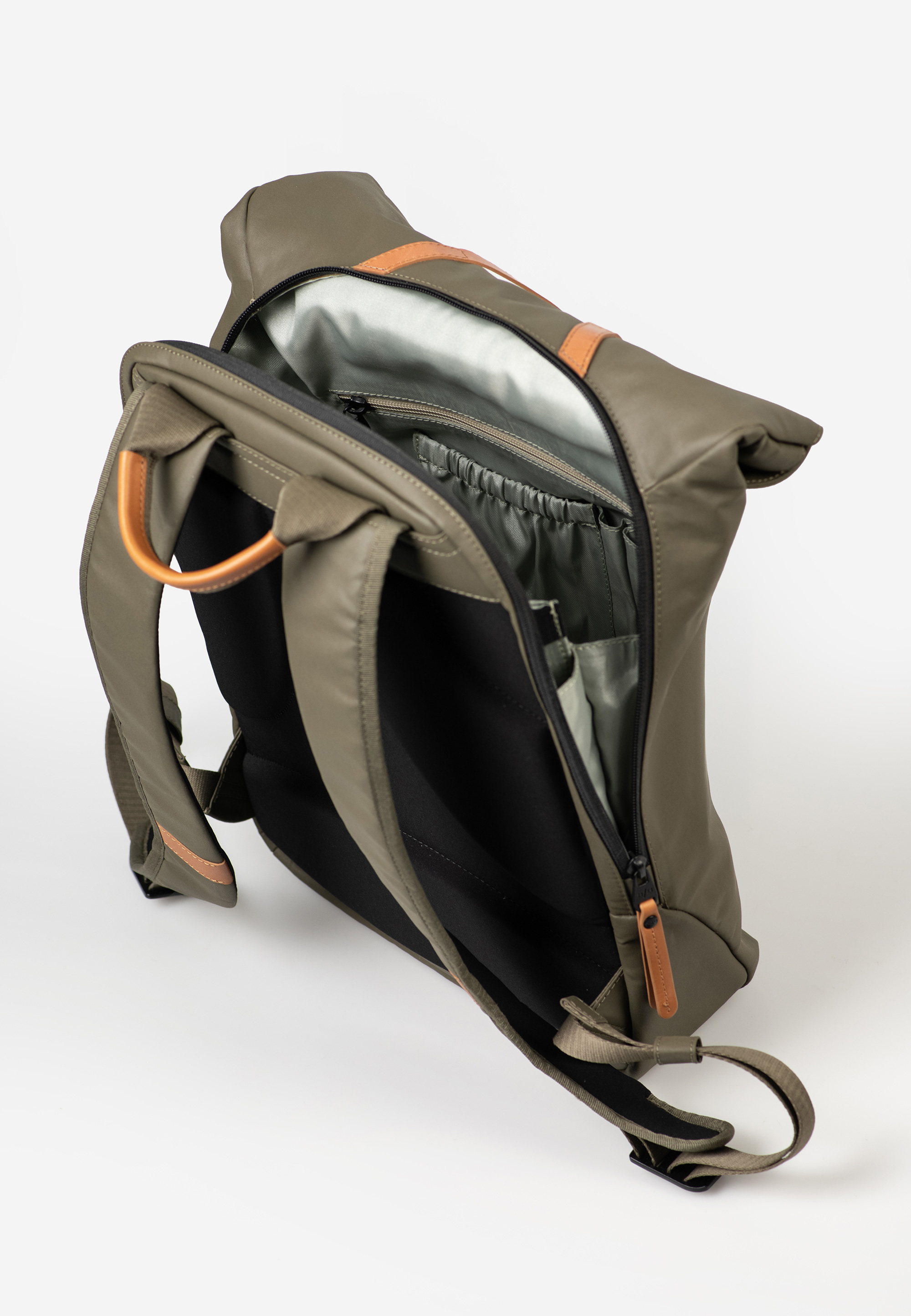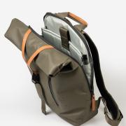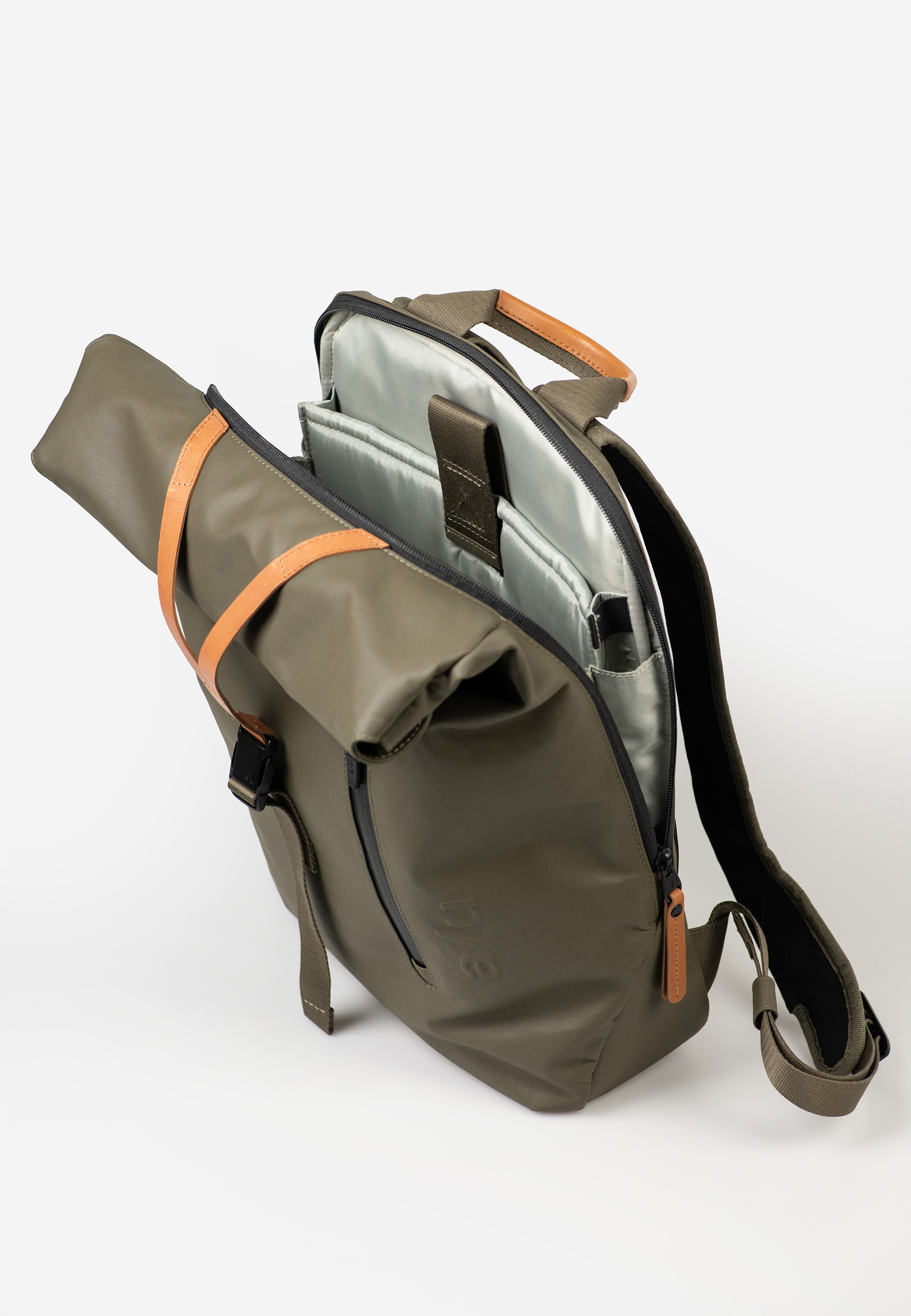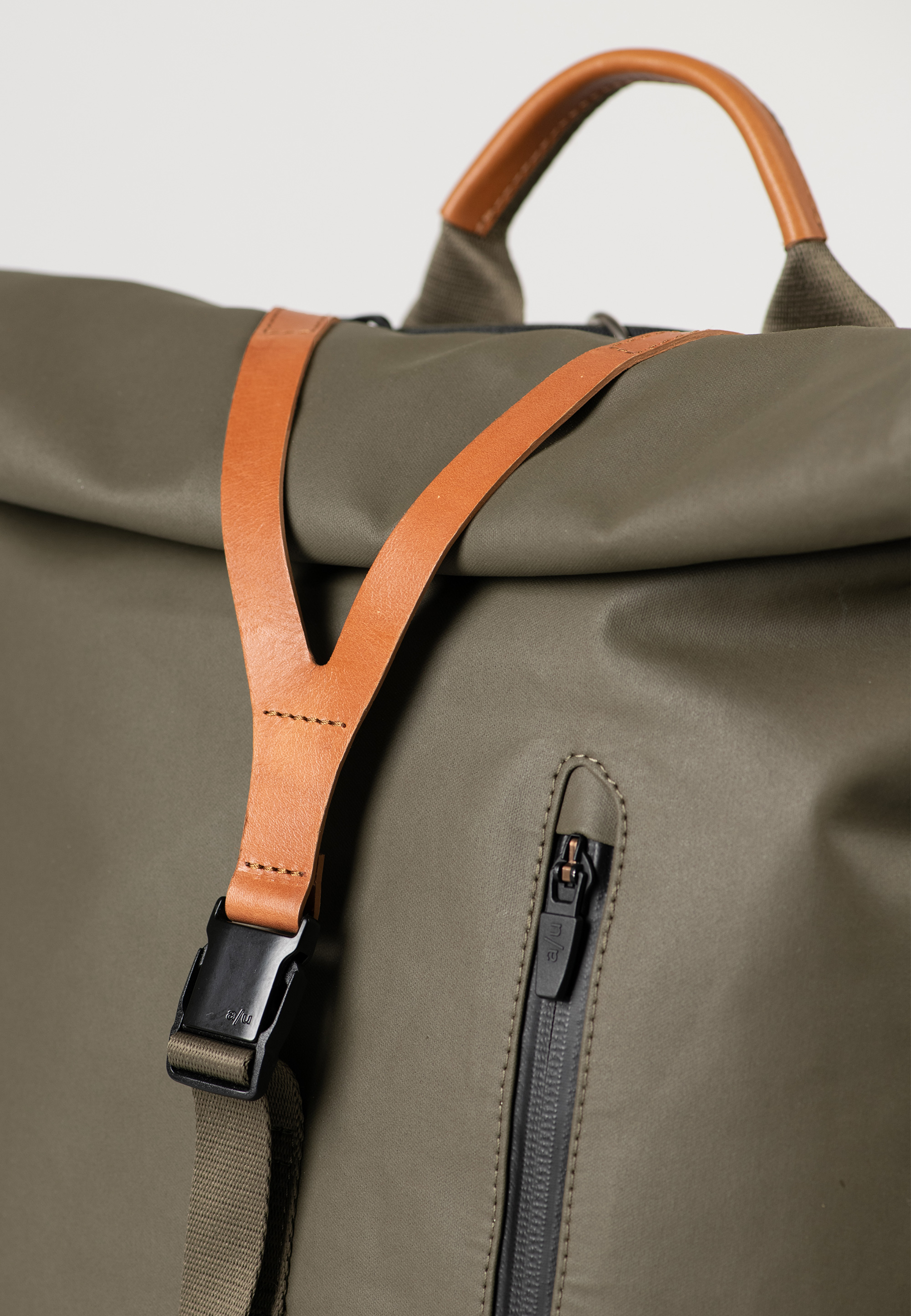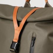 - Hauptfach mit Rollverschluss schließt mit Druckknöpfen und Lederlasche mit Steckschloss