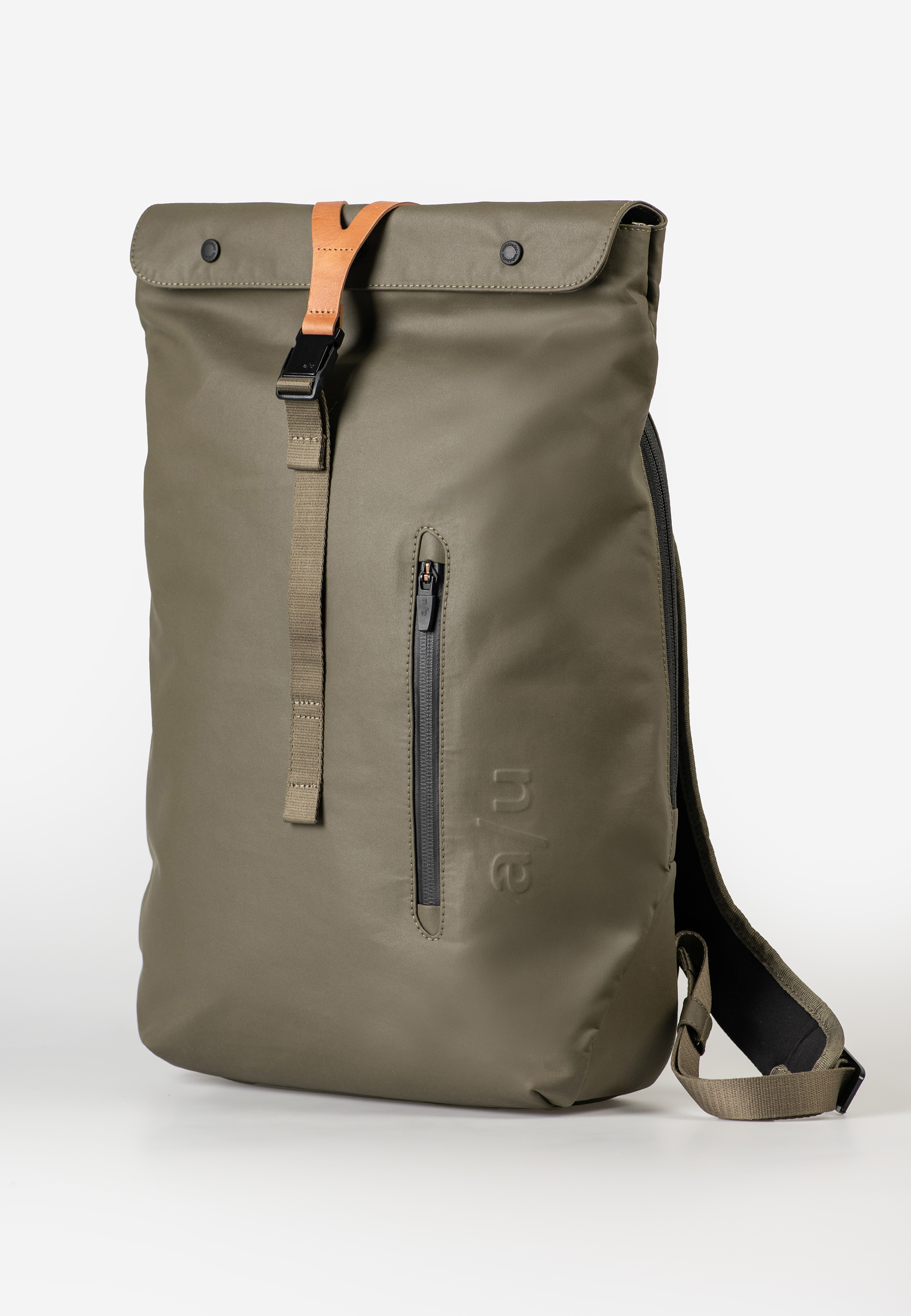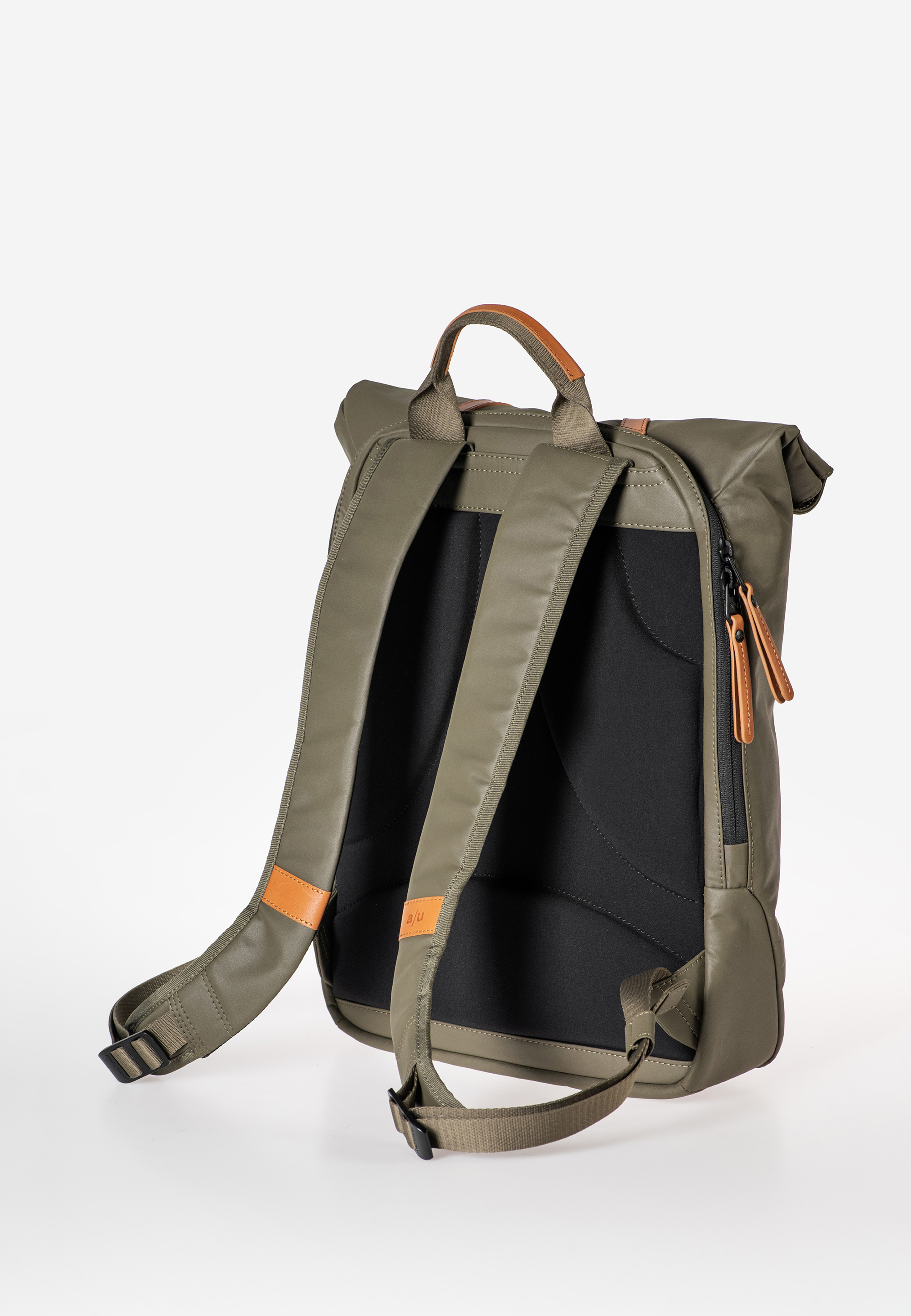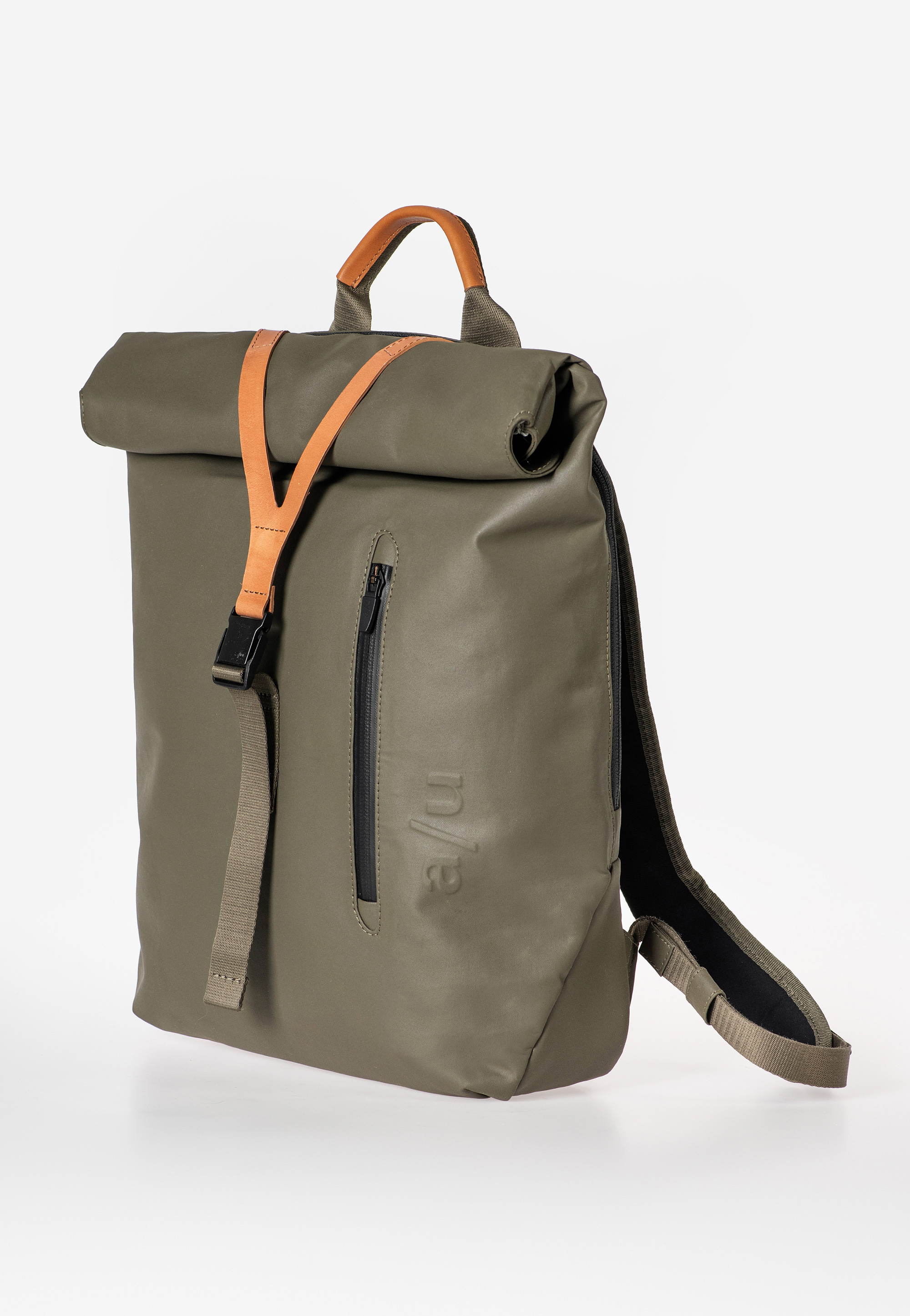 - Hauptfach mit Rollverschluss schließt mit Druckknöpfen und Lederlasche mit Steckschloss