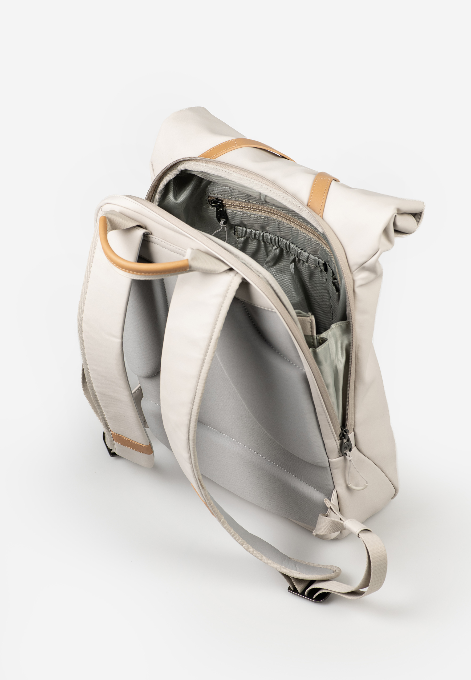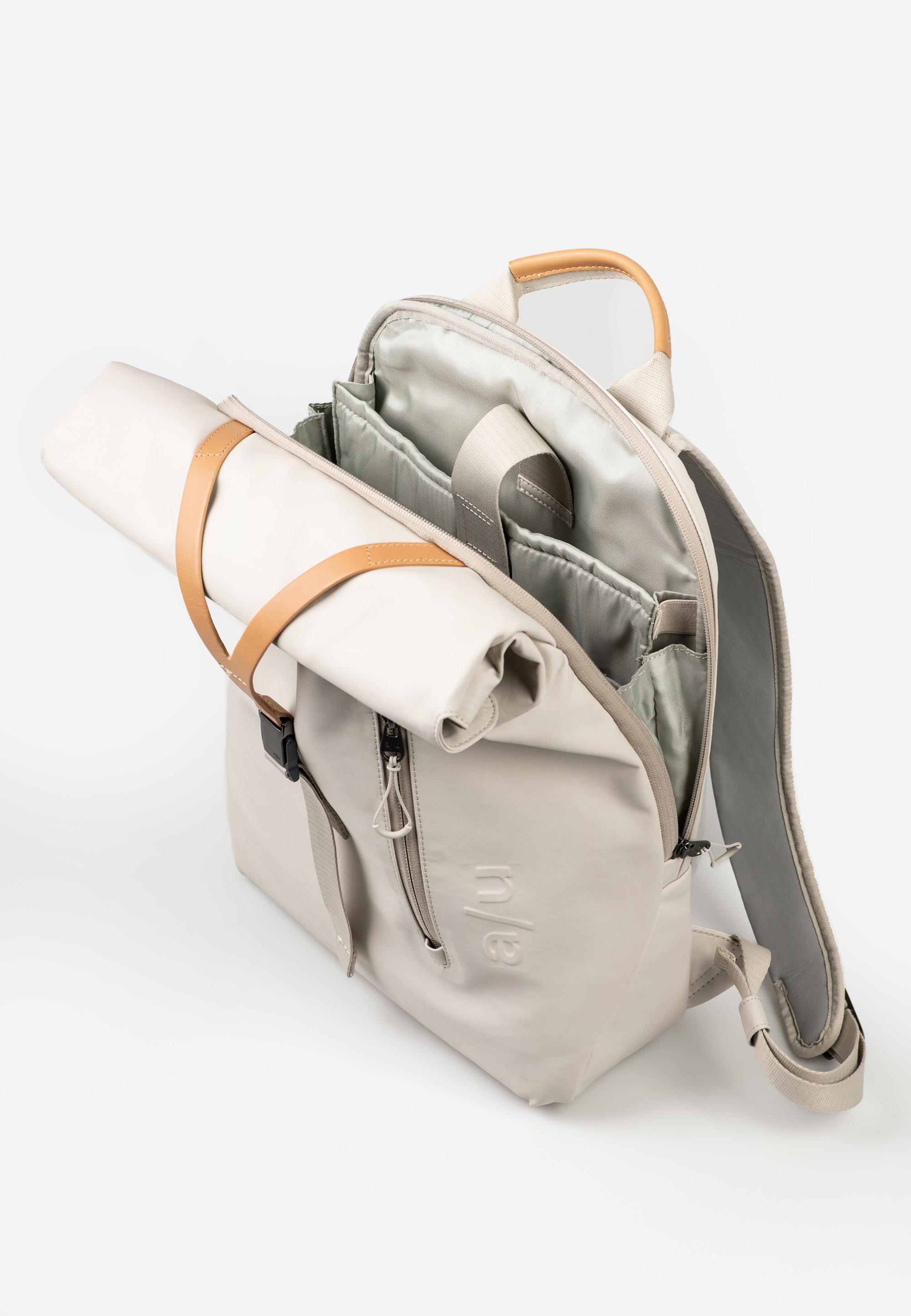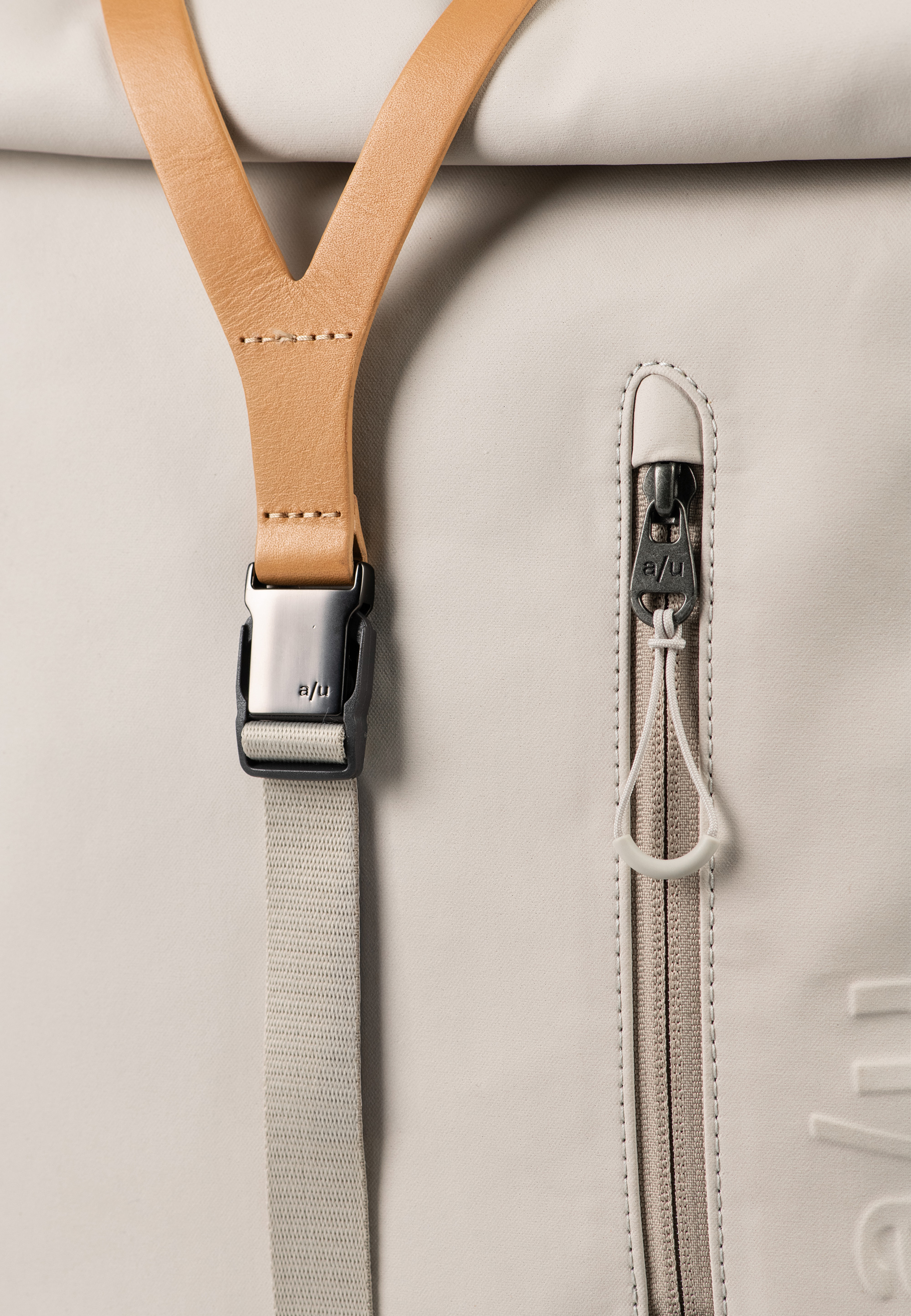 - Hauptfach mit Rollverschluss schließt mit Druckknöpfen und Lederlasche mit Steckschloss