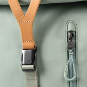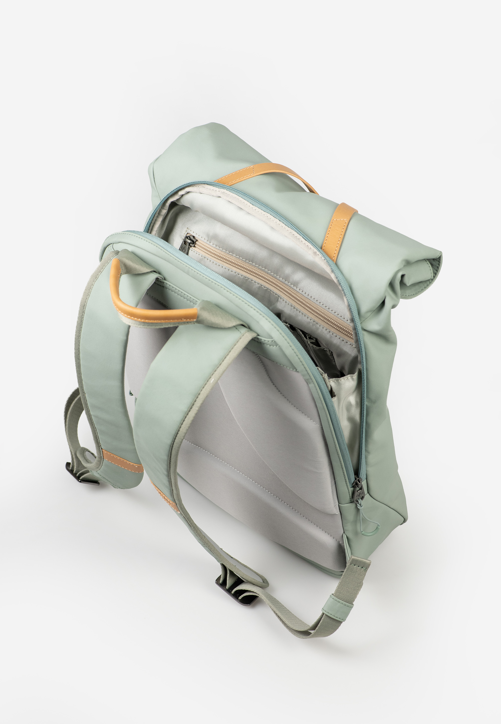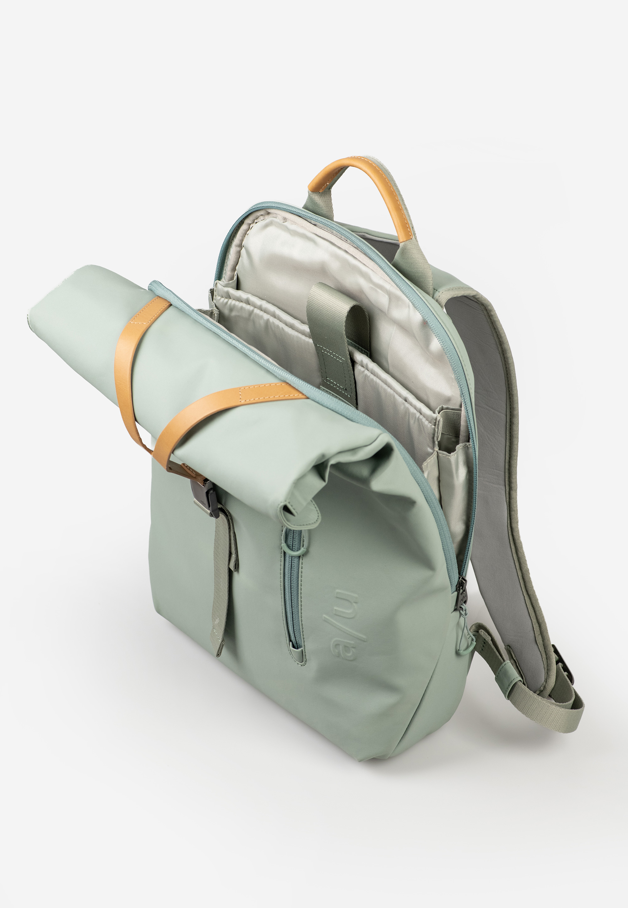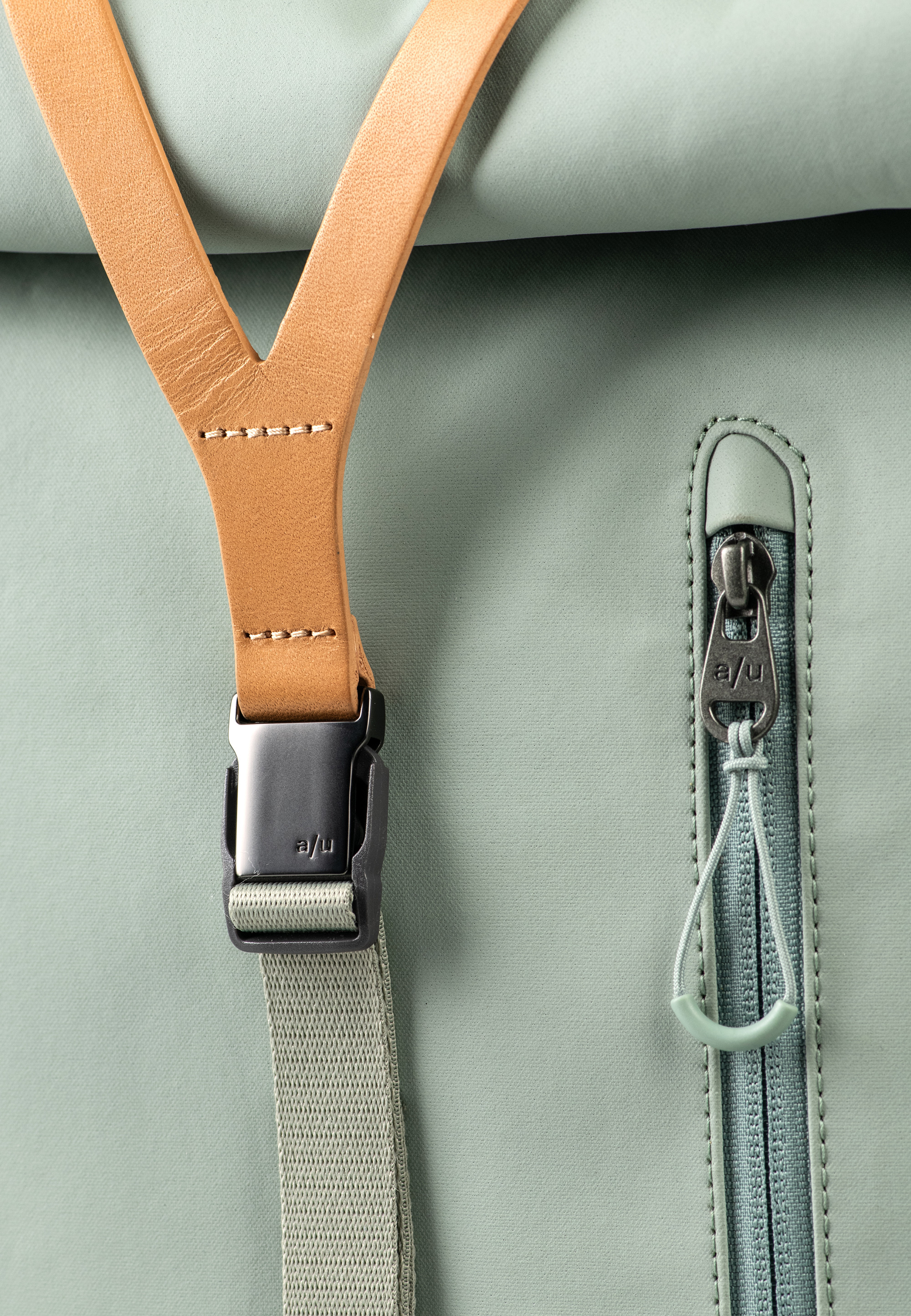 - Hauptfach mit Rollverschluss schließt mit Druckknöpfen und Lederlasche mit Steckschloss