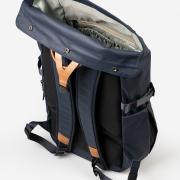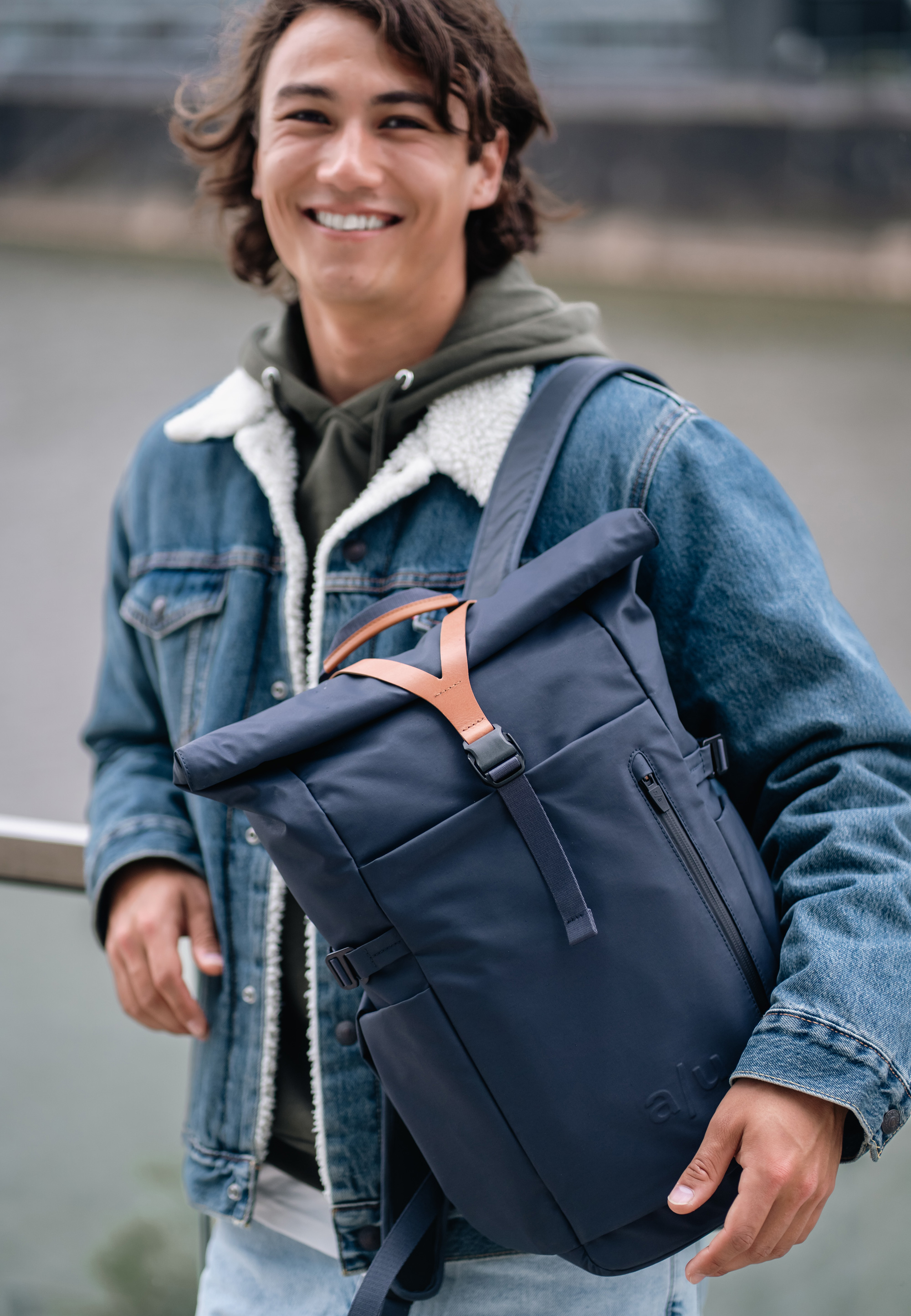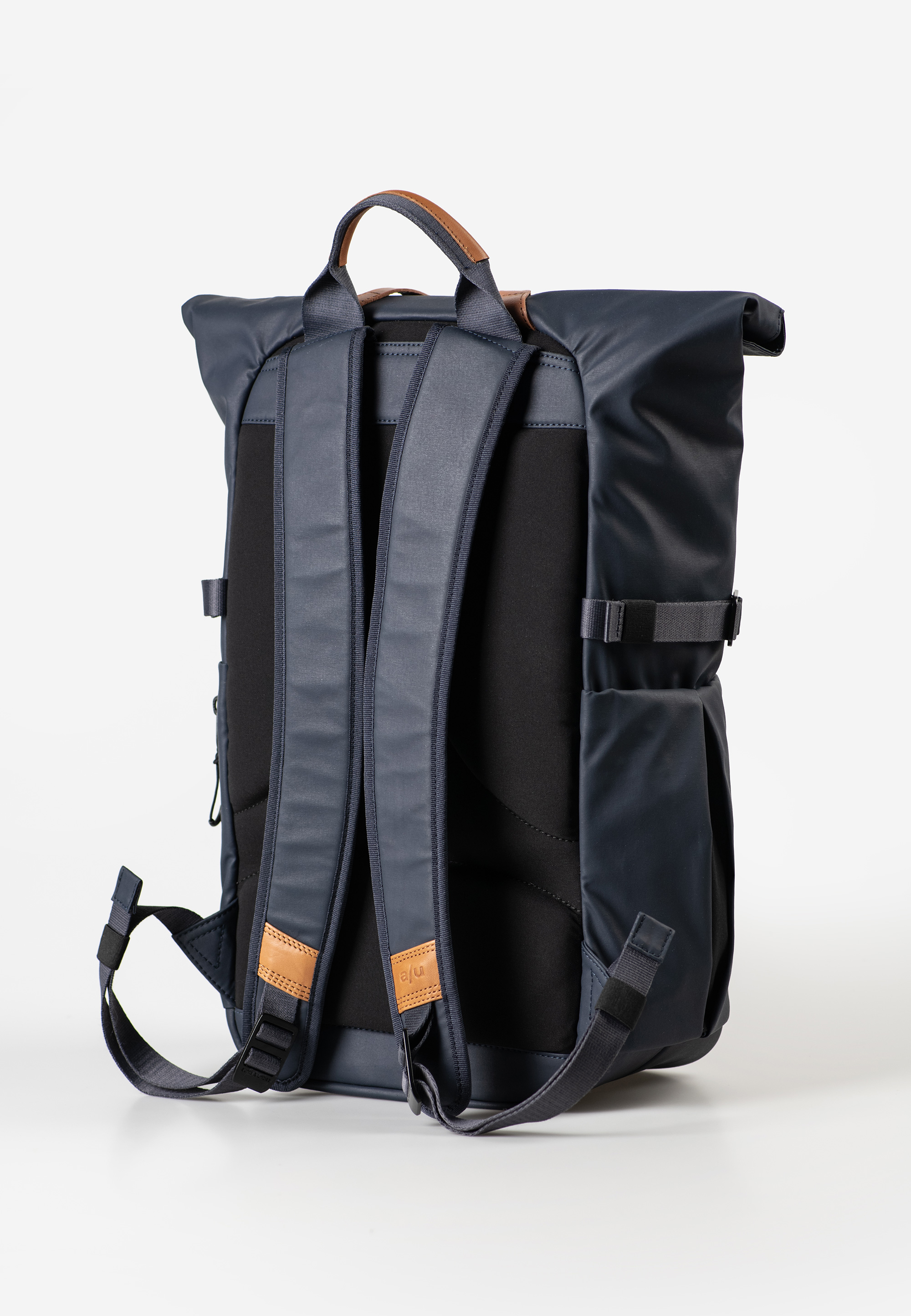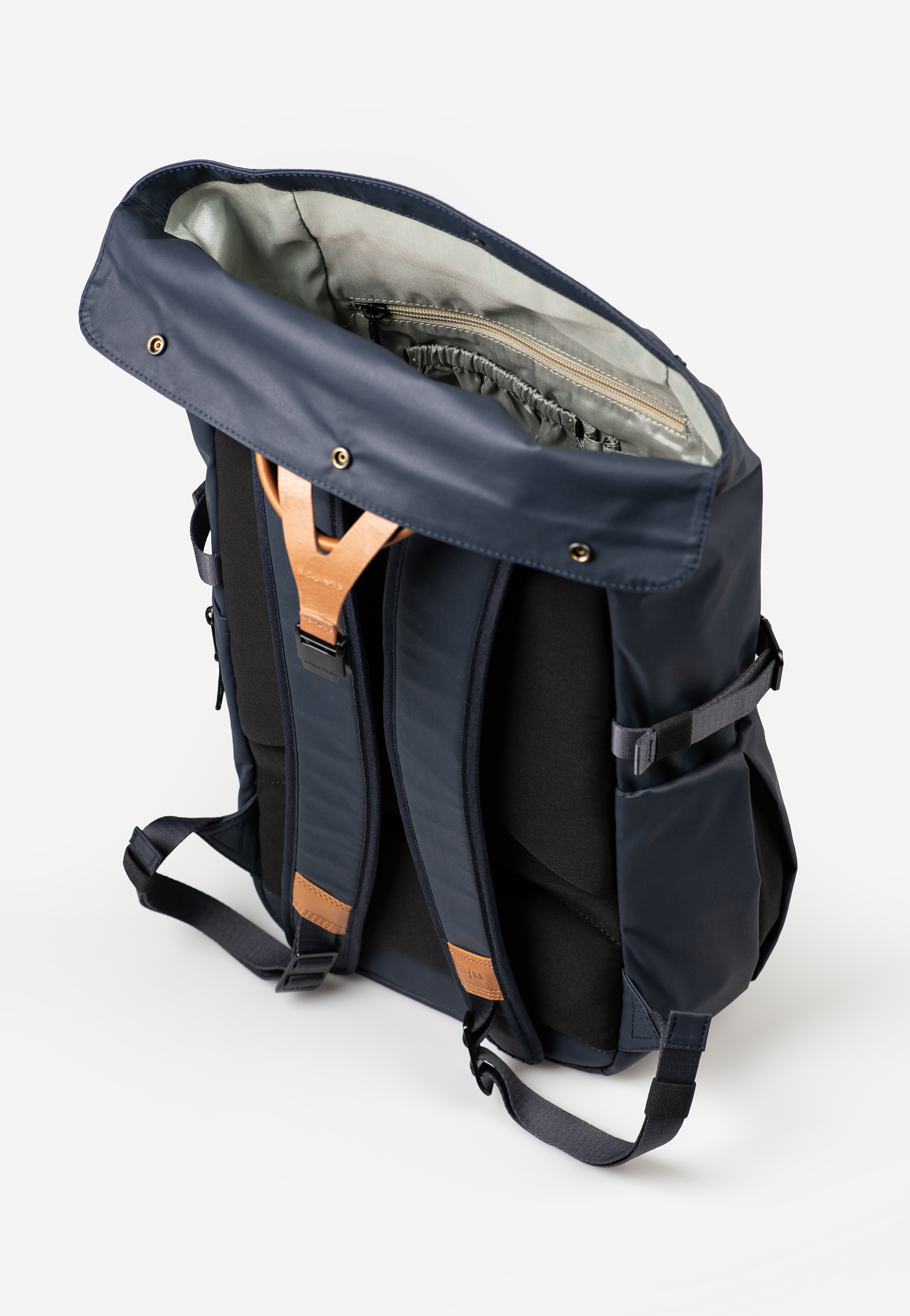 Tokachi RE scores with its lightweight, sophisticated design that can take on any adventure. The weatherproof backpack is made from recycled nylon. Applications and a base made from carefully tanned premium leather create a distinctive look. The flexible main compartment with roll closure, a padded notebook compartment, various inner and outer pockets and practical details such as pen loops and a key strap ensure optimal organization. Padded shoulder straps and an ergonomic back guarantee the highest level of carrying comfort.
