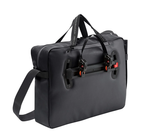 Aktentasche und Fahrradtasche in einem - diese wandelbare Bürotasche lässt sich mit einem Handgriff am Fahrrad-Gepäckträger mittels einer Plug-and-Ride-Schiene an- und abmontieren. Perfekt also für den Commuter-Alltag und auch bequem zu tragen, wenn Mann oder Frau auch zu Fuß unterwegs ist - hierfür wird die Schiene einfach nur in dem dafür vorgesehenen Seitenfach aufbewahrt.