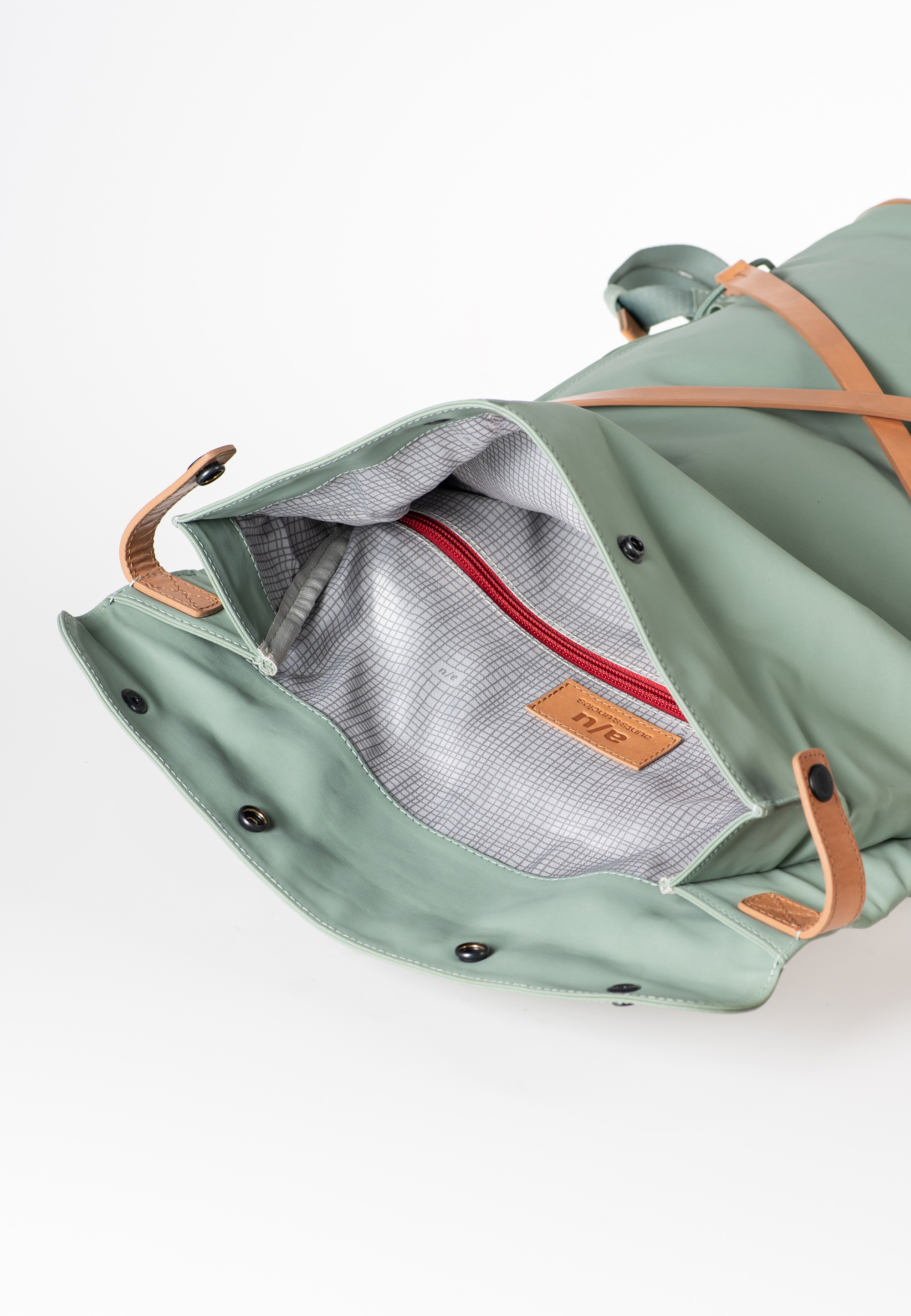 Osaka verbindet wasserabweisendes Baumwollgewebe mit authentischem Leder. Der leichte Roll-top-Rucksack mit gepolsterten Schultergurten und seidenmattem Coating bietet Platz für Unterlagen in A4-Format und ein Notebook bis 15 Zoll.