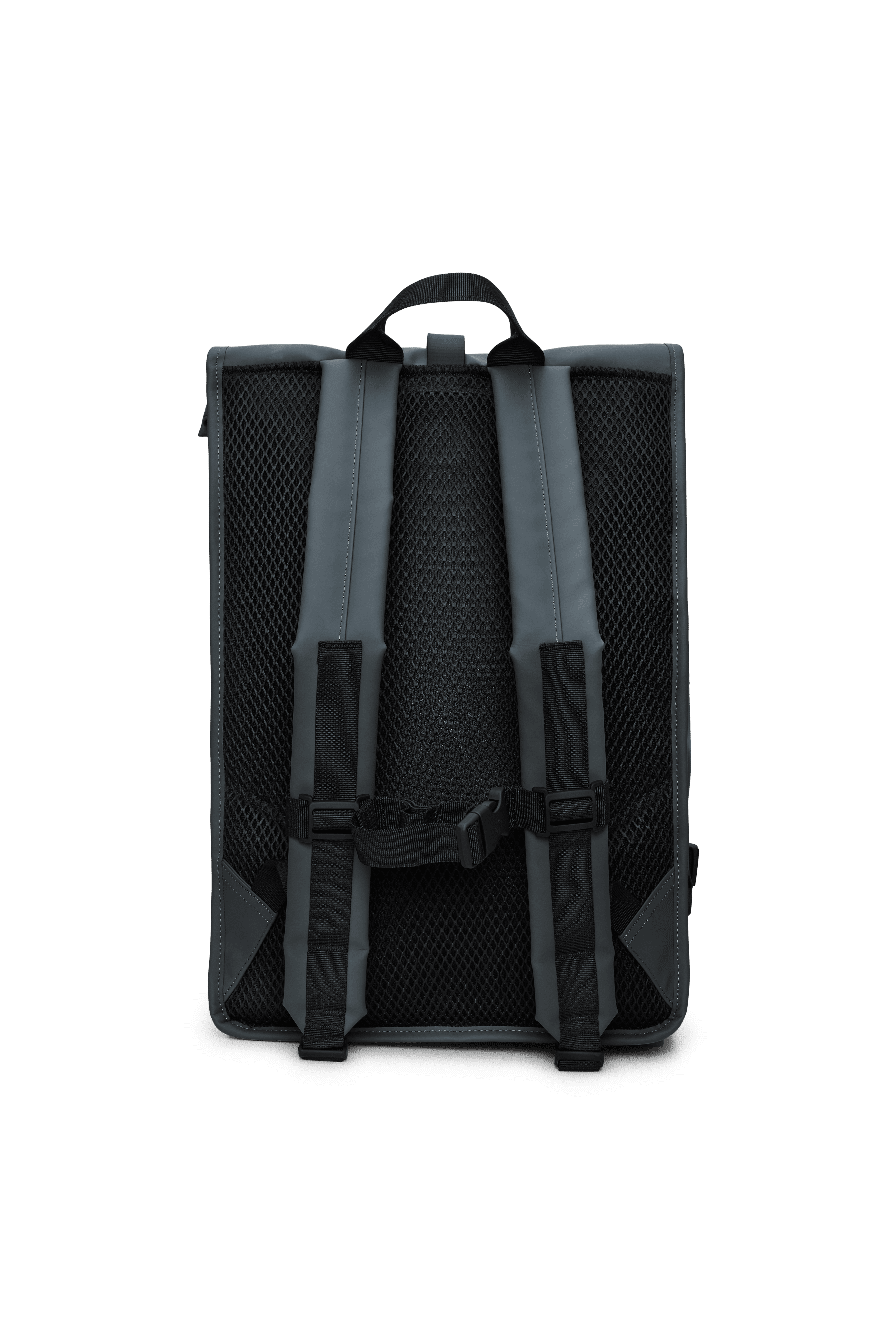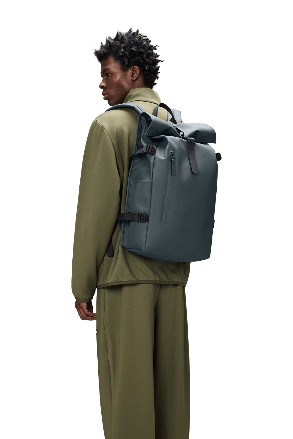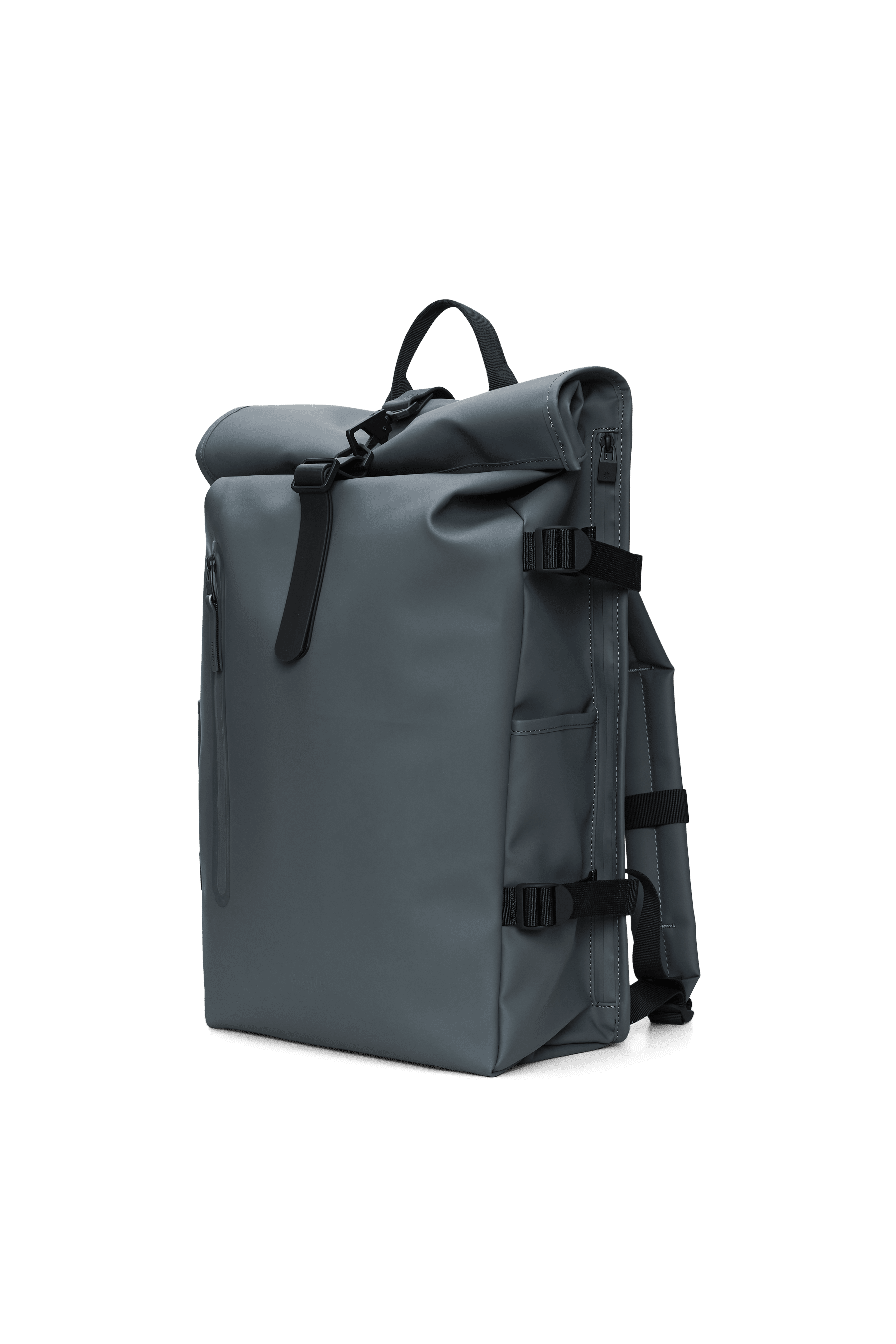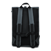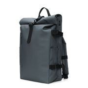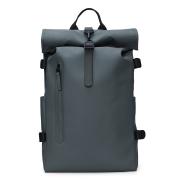 Der Rolltop Rucksack ist aus dem charakteristischen wasserdichten PU-Gewebe von Rains gefertigt, das robust und langlebig ist und sich angenehm anfühlt.