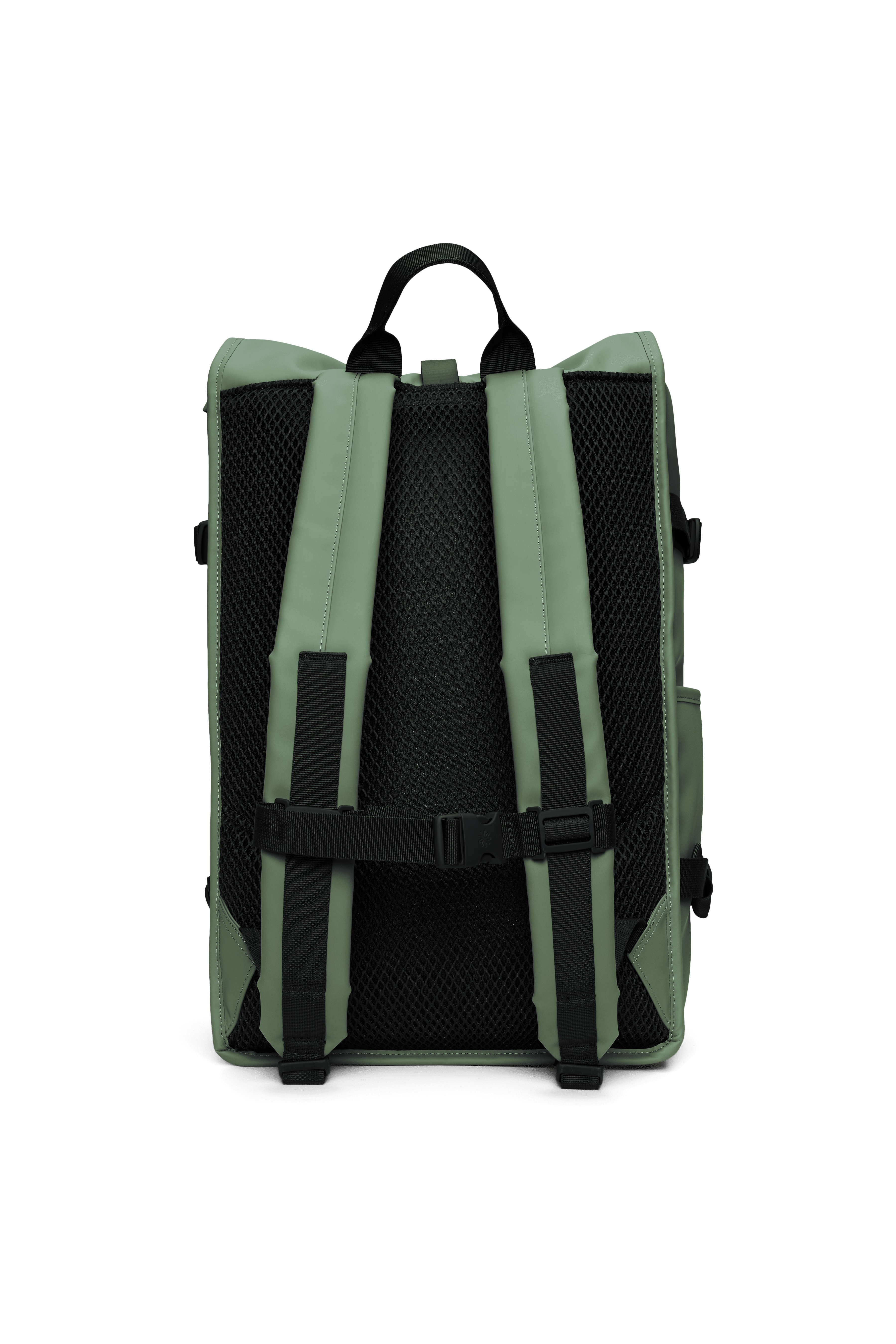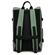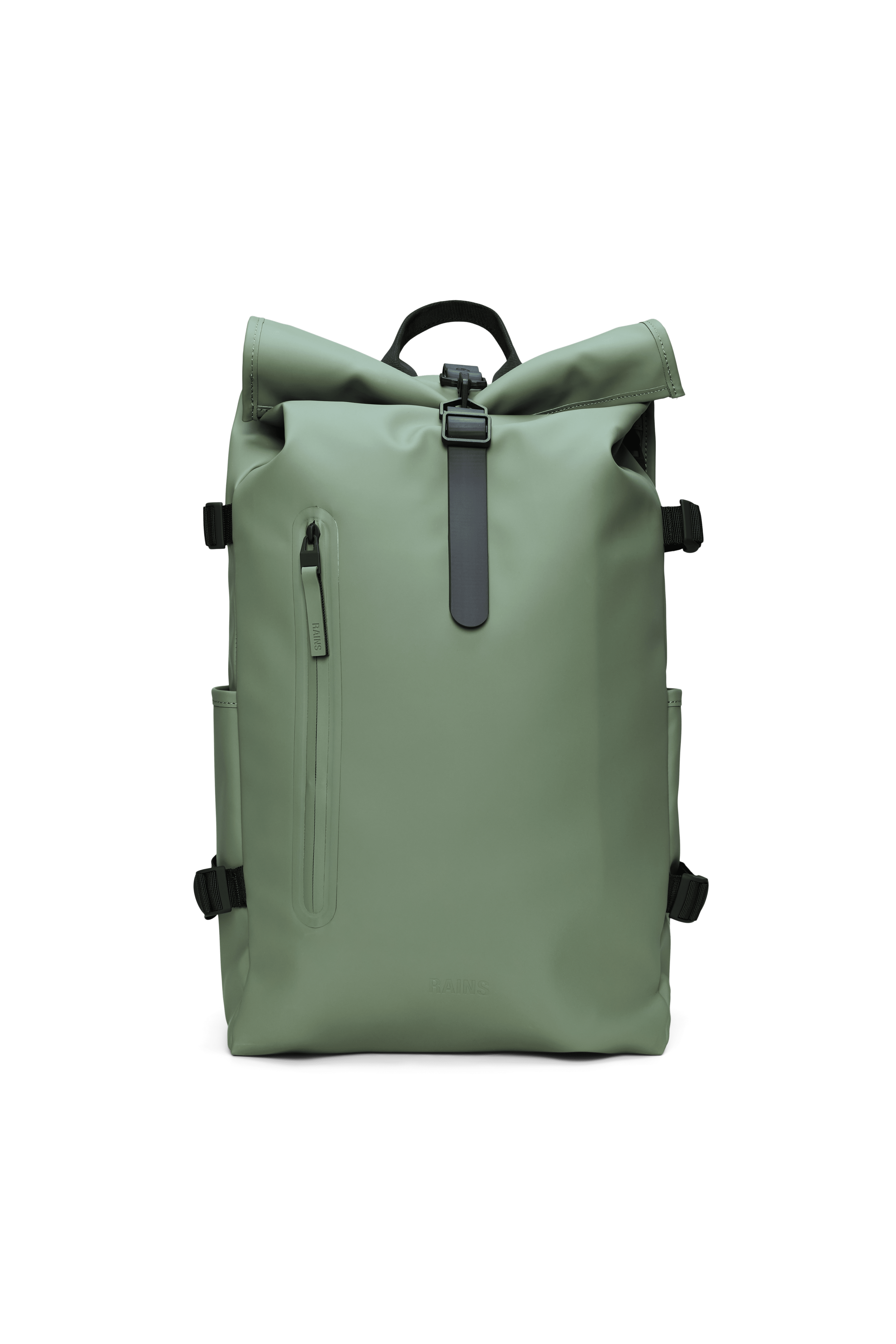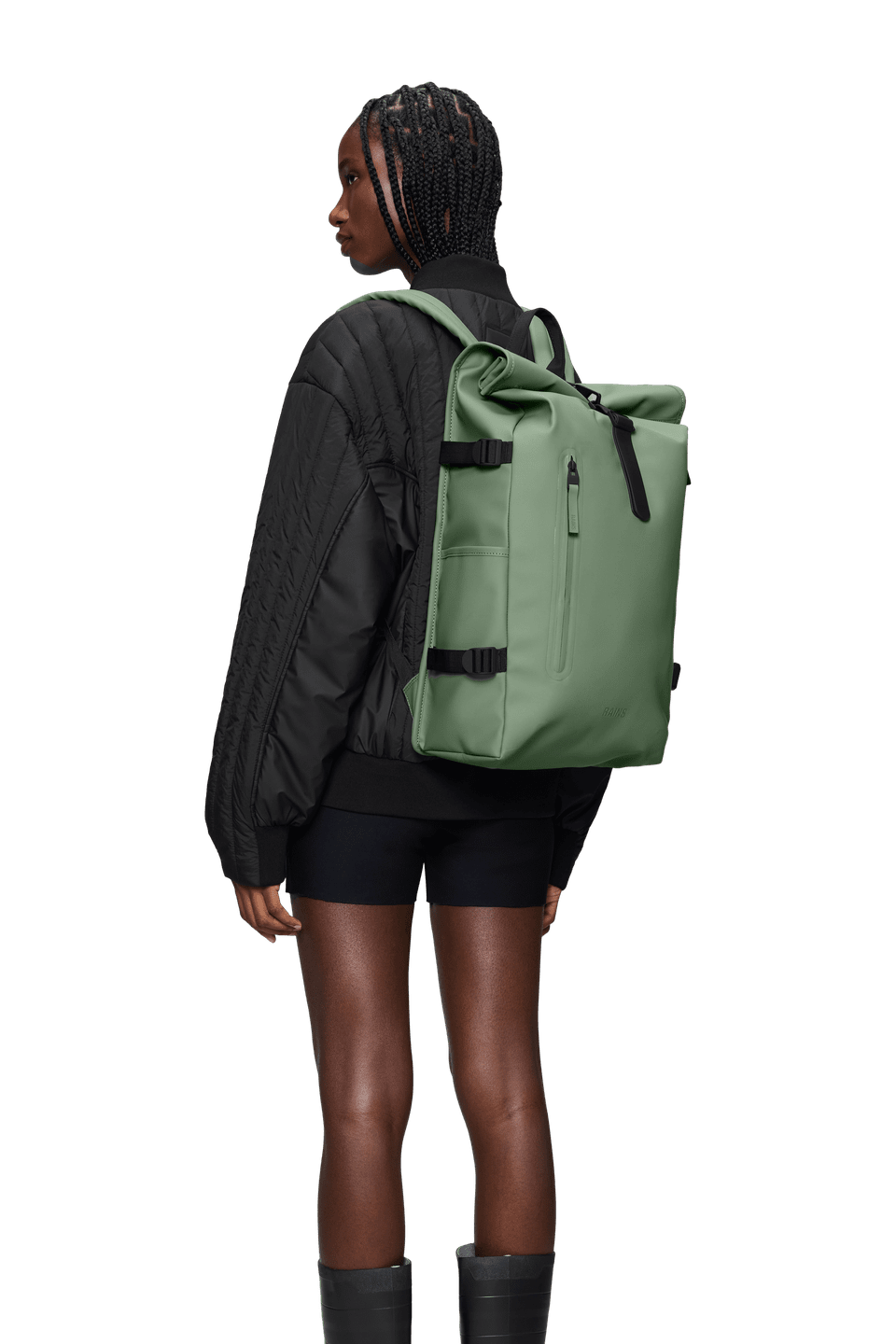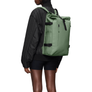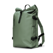Der Rolltop Rucksack ist aus dem charakteristischen wasserdichten PU-Gewebe von Rains gefertigt, das robust und langlebig ist und sich angenehm anfühlt.