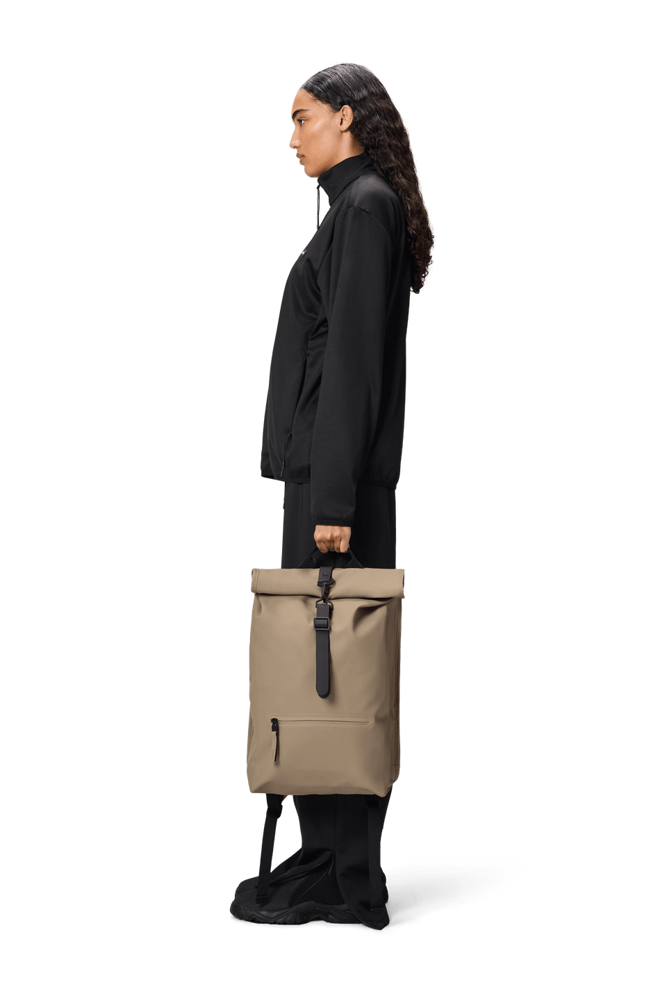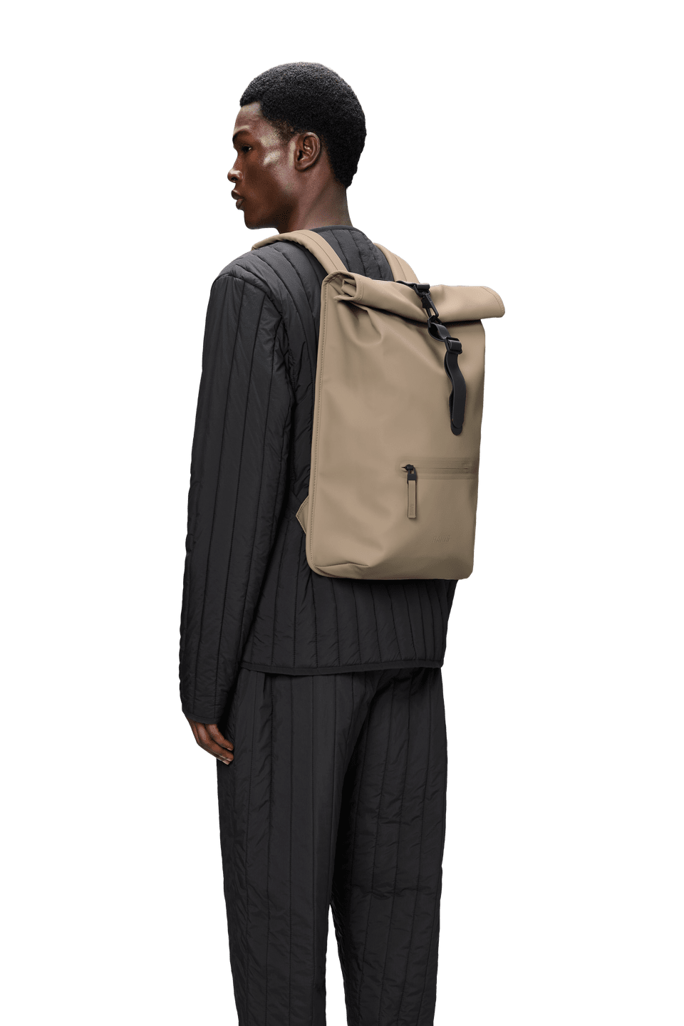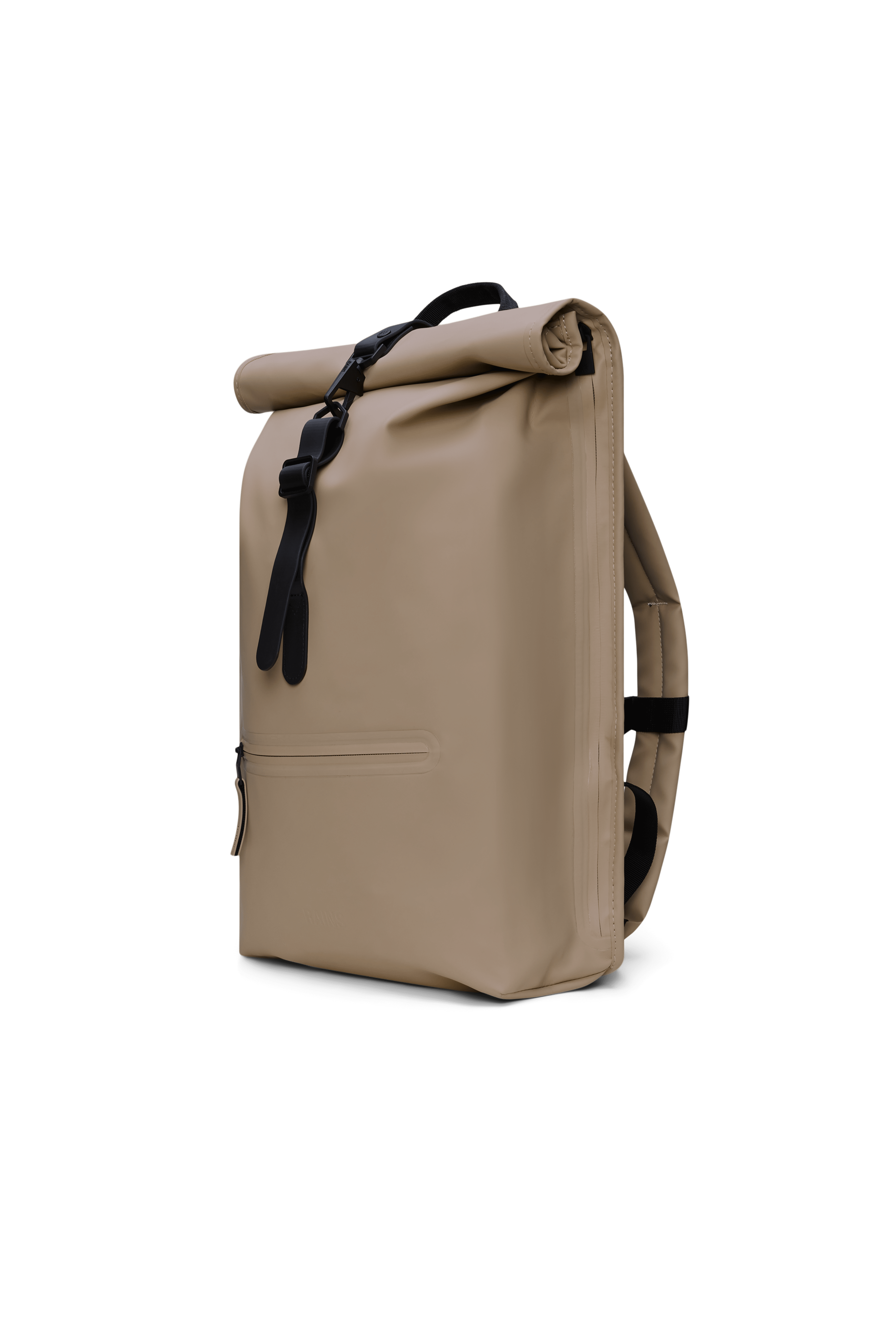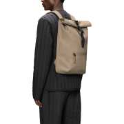Der Rolltop Rucksack ist aus dem charakteristischen wasserdichten PU-Gewebe von Rains gefertigt, das robust und langlebig ist und sich angenehm anfühlt.