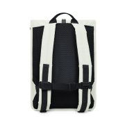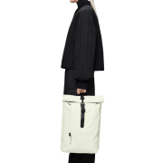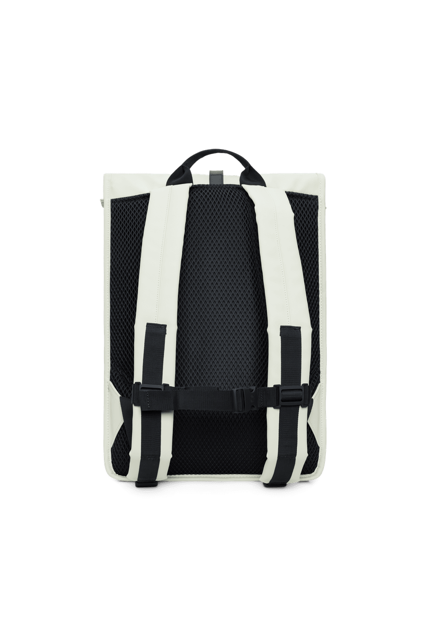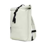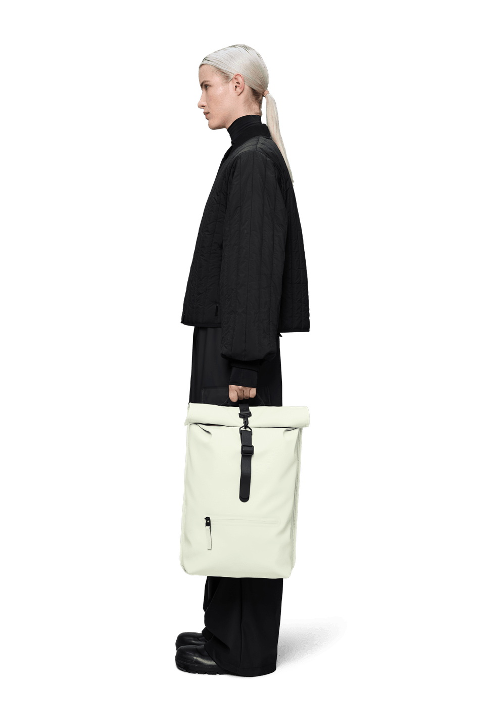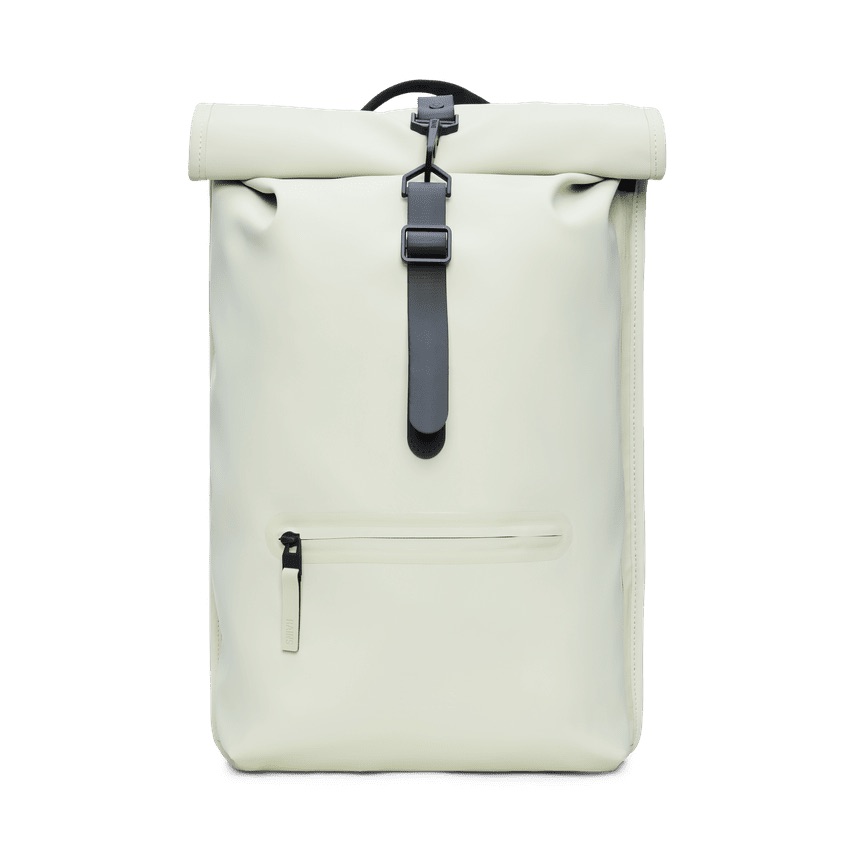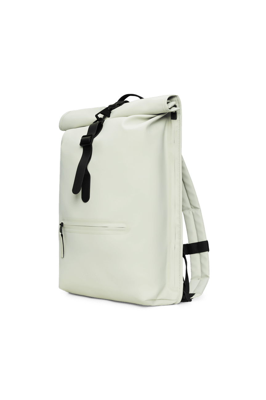 Der Rolltop Rucksack ist aus dem charakteristischen wasserdichten PU-Gewebe von Rains gefertigt, das robust und langlebig ist und sich angenehm anfühlt.